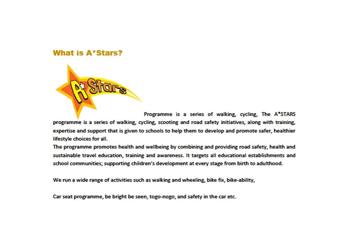 The A*STARS programme is a series of walking, cycling, scooting and road safety initiatives, along with training, expertise and support that is given to schools to help them to develop and promote safer, healthier lifestyle choices for all.