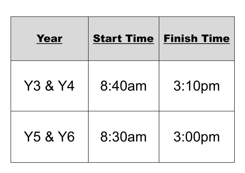 Year 5 and 6 start school at 8:30am and finish at 3:00pm. Year 3 and 4 start school at 8:40am and finish at 3:10pm.